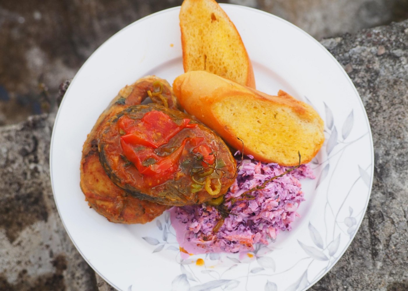 • Main: Stuffed Snapper, Rice & Peas, and Salad